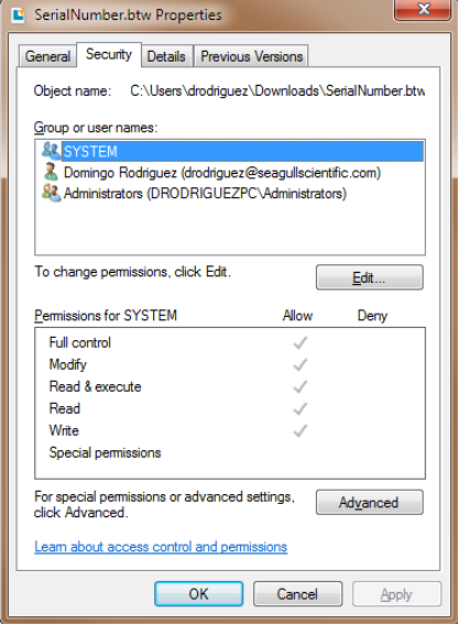 - You now need to make sure that you set the minimum permissions to this file. This will need to be done via the "Advanced" button on this same tab. This is because permissions are being inherited from the object's parent.