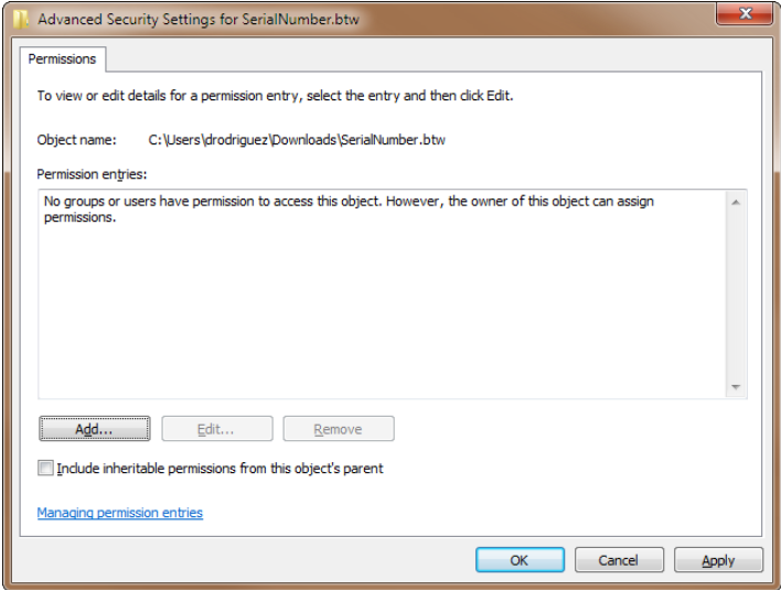 - Click on "Change Permissions..." button. Disable the "Include inheritable permissions from this object's parent" checkbox, click "Add" to confirm. Remove now all users and groups. You should end up with something like this: