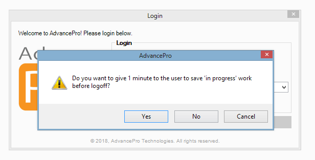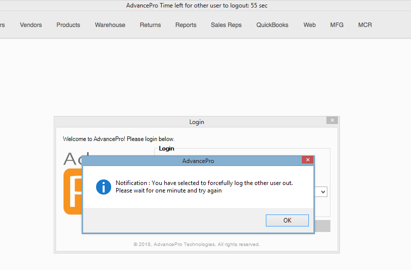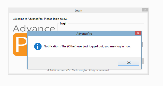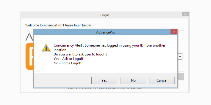 AdvancePro Concurrency Alert : Someone has logged in using your ID from another location.