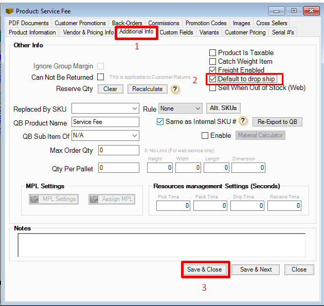 2. Go to Additional Info Tab > Enable "Default to Drop Ship" > Hit Save & Close