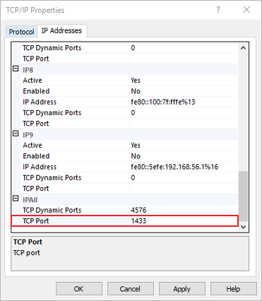 4. In the IP Addresses tab > Scroll down to the IPAll section and enter a port number in the TCP Port field (1433 is the standard SQL Server port) > Click Apply and click OK