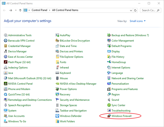 8. Select Windows Firewall > On the left pane click Advanced settings