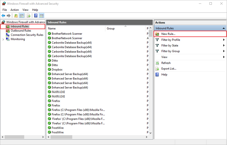 9. On the left pane of the Windows Firewall with Advanced Security screen select Inbound Rules > On the right-most pane, click New Rule to bring up the New inbound Rule Wizard