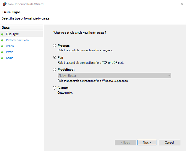 11. In the Protcocols and Ports section select the TCP radio button > Select the Specific local ports radio button and enter the appropriate port number > Click Next