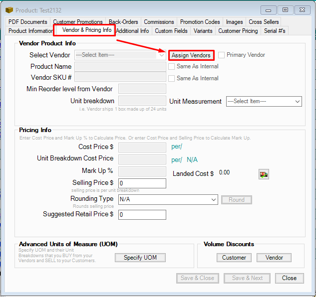 3. A window will open that contains all the product details. Go to 'Vendor & Pricing Info' tab then click 'Assign Vendors'.