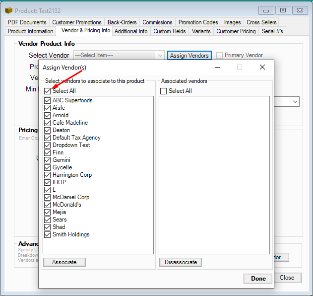 4. Upon clicking the 'Assign Vendors' button, a window will open for you to assign vendors. Click the 'Select All' checkbox to assign all vendors for this product.