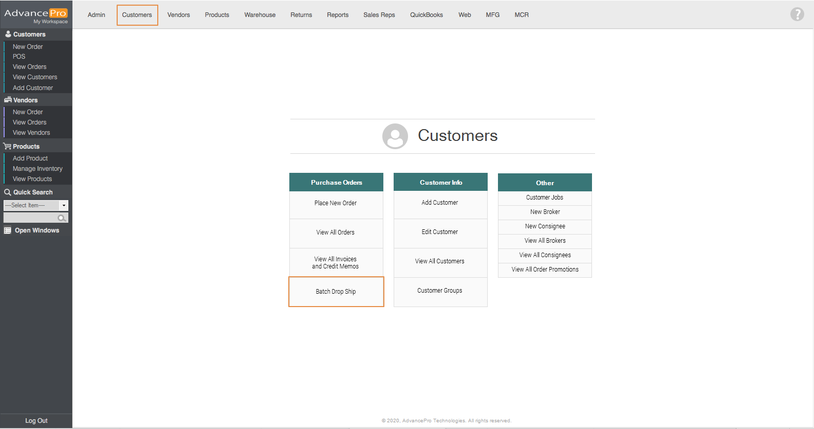 - To access the new feature, go to Customers switchboard and click on Batch Drop Ship.