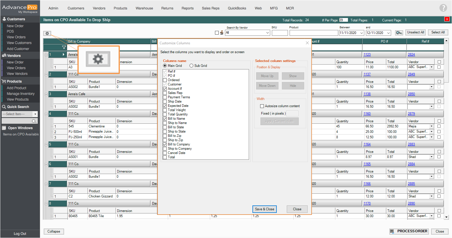 - By clicking on the sub-grid radio button you'll see these columns that are related to the product and the order.