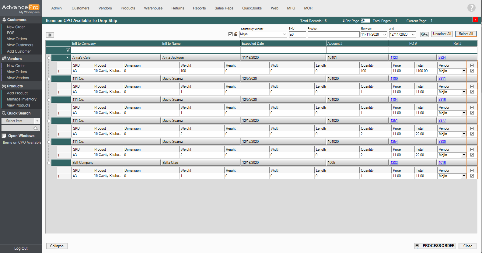 - To process the orders, just tick the box on the far right side of the grid and then click on Process Order. You can also use the Select All button beside the magnifying glass.