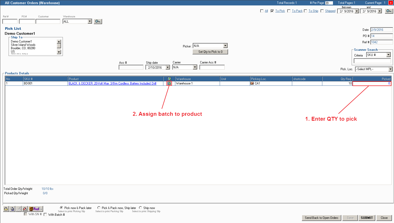 1. After confirming the above you may begin creating the order. When you reach the warehouse picking stage you will see a