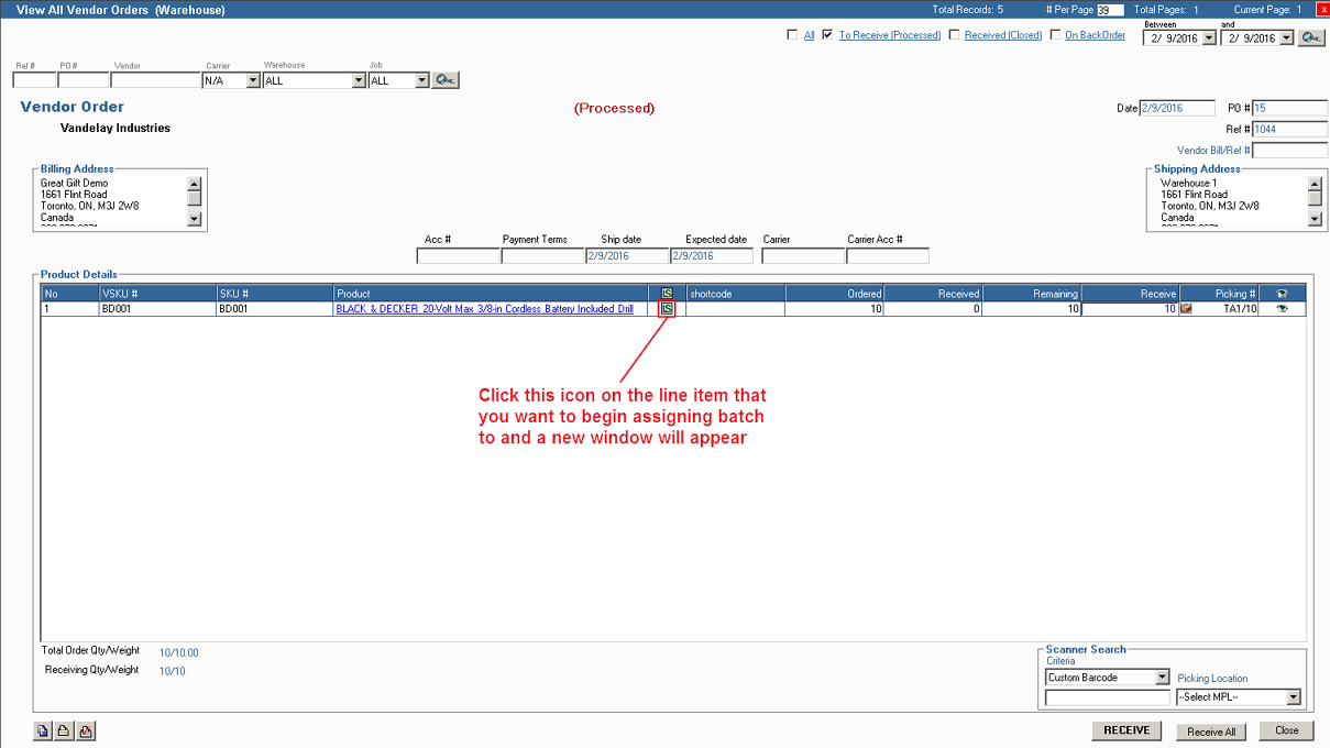 Batch Module - Applying Batch to Receiving Vendor Order