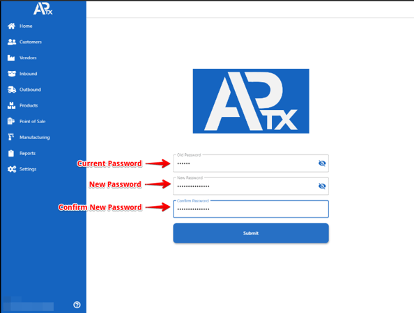 3. On the Change Password screen, Enter your Old Password (Current Password the you are using) and Create/Input your desired New password and Confirm it (retype password to Match the new password) and hit Submit.
