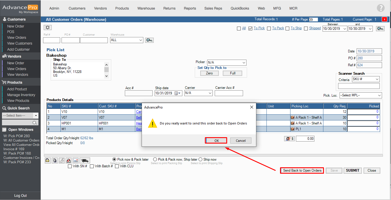 3. Send the order on the warehouse back to Open Orders. A prompt will pop-up hit OK. After which, enter the reason for sending back the order.