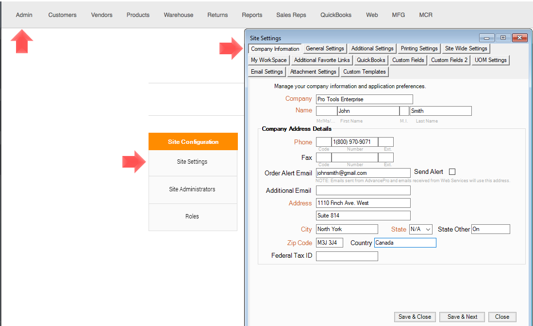 1. Go to the "Admin" switchboard, click on "Site Settings". Under "Company Information", you can enter or update your company's contact information such as the company name, phone number, and address. Make sure to click "Save & Close", otherwise changes won't be saved.