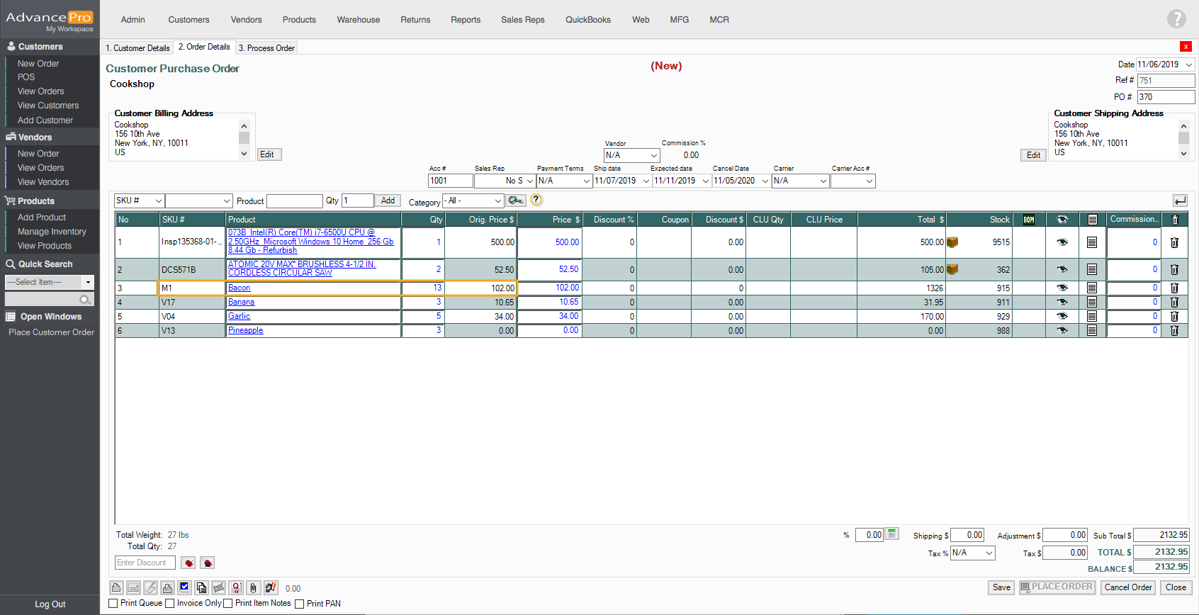 - Then the user can add one or more products right below that line item. There are 2 ways to add products, users can either use the SKU / Product name or use the Product Selector