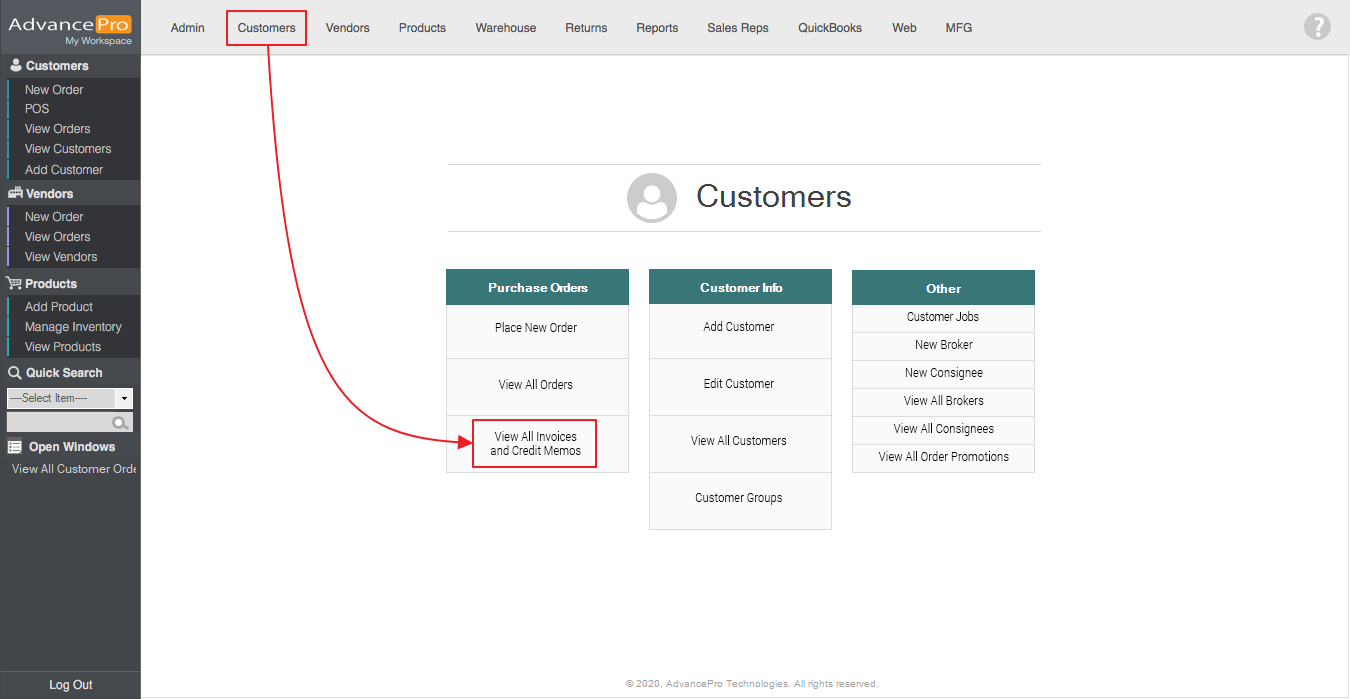 2. After Issuing Customer Returns, a new "Pending Credit Memo" will be created. Go to Customers > View All Invoices And Credit Memos.