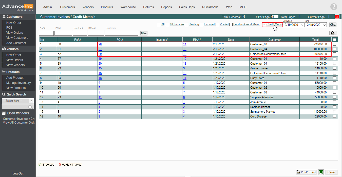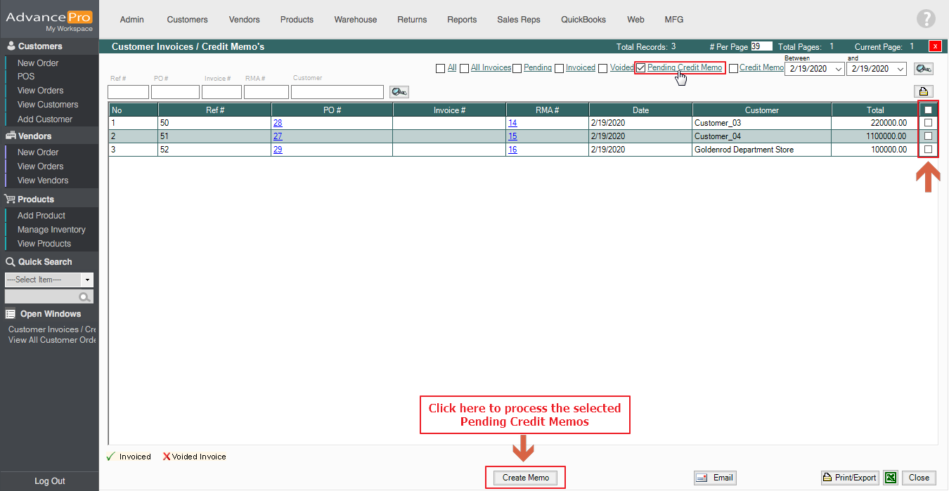 AdvancePro has added the Pending Credit Memo stage to increase the security and assurance for the Customer Returns process, and the batch processing feature will help in Credit Memo creation considerably faster.