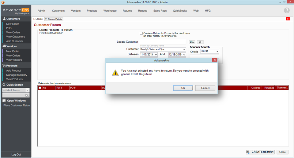 "You have not selected any items to return. Do you want to proceed with a general Credit Only item" - Hit OK