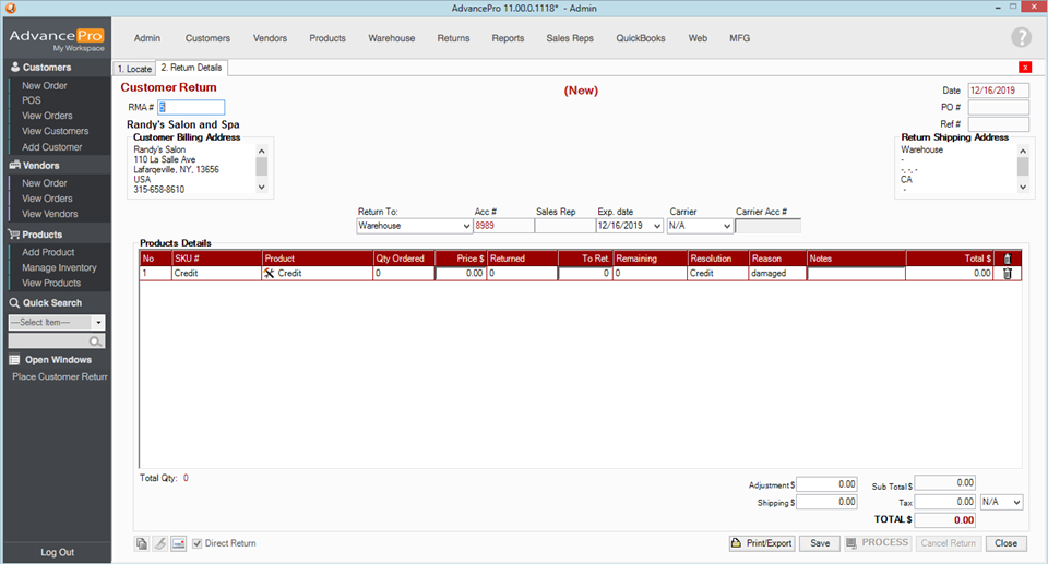 This feature allows the AdvancePro user to apply a dollar-value credit to a customer without requiring the Return to contain product line items.