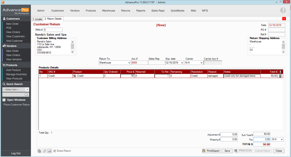 5. The Customer Return will then be created, containing the Credit service item. Enter the notes/reason for this credit. and hit Save and Process