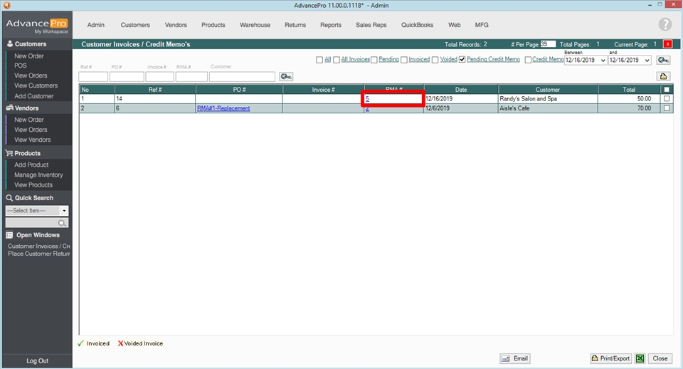 6. Open the pending credit memo on the Customer Invoices/Credit Memo's screen