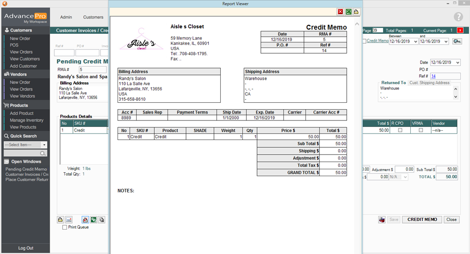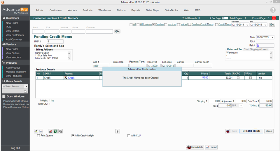 This is now your credit memo. You may confirm the credit memo when ready - it will export to QuickBooks the same way as any standard Credit Memo with Inventory Items on them.