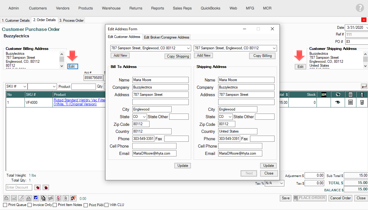 3. To edit or update customer info in Customer Purchase Order, click on either of the Edit buttons and an "Edit Address Form" window will pop-up. You may edit the customer info before placing an order.