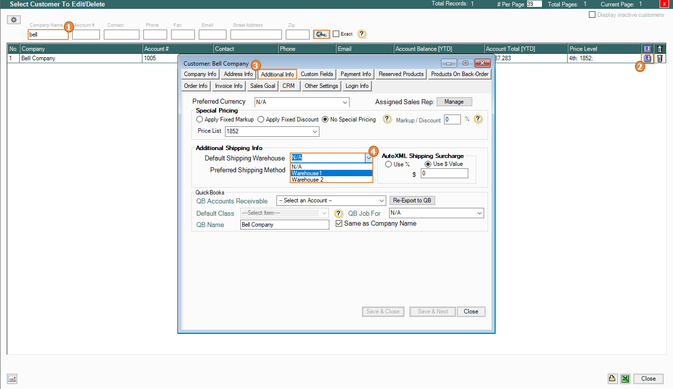 and go to the Additional Info tab. Under Additional Shipping Info, select a warehouse form the Default Shipping Warehouse drop-down and then click on Save & Close.