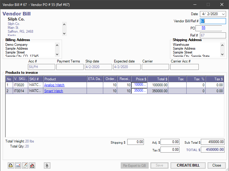 5. The Pending Vendor Bill will pop up after clicking PLACE ORDER