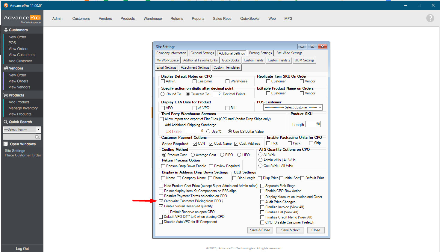 1. On the Site Settings, go to Additional Settings and check the box, "Overwrite Customer Pricing on CPO"