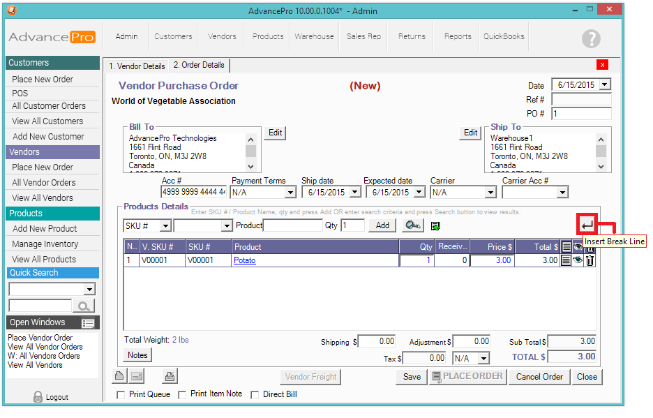 - On Step#3, add just any item on the order, and Insert a BREAK LINE.