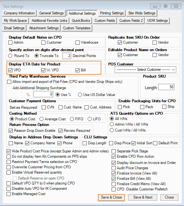 To display the ETA in the VPO, go to Admin switchboard > Site Settings and click on Additional Settings tab. Under Display ETA Date for Product, tick VPO, W.VPO & Bill and click on Save & Close