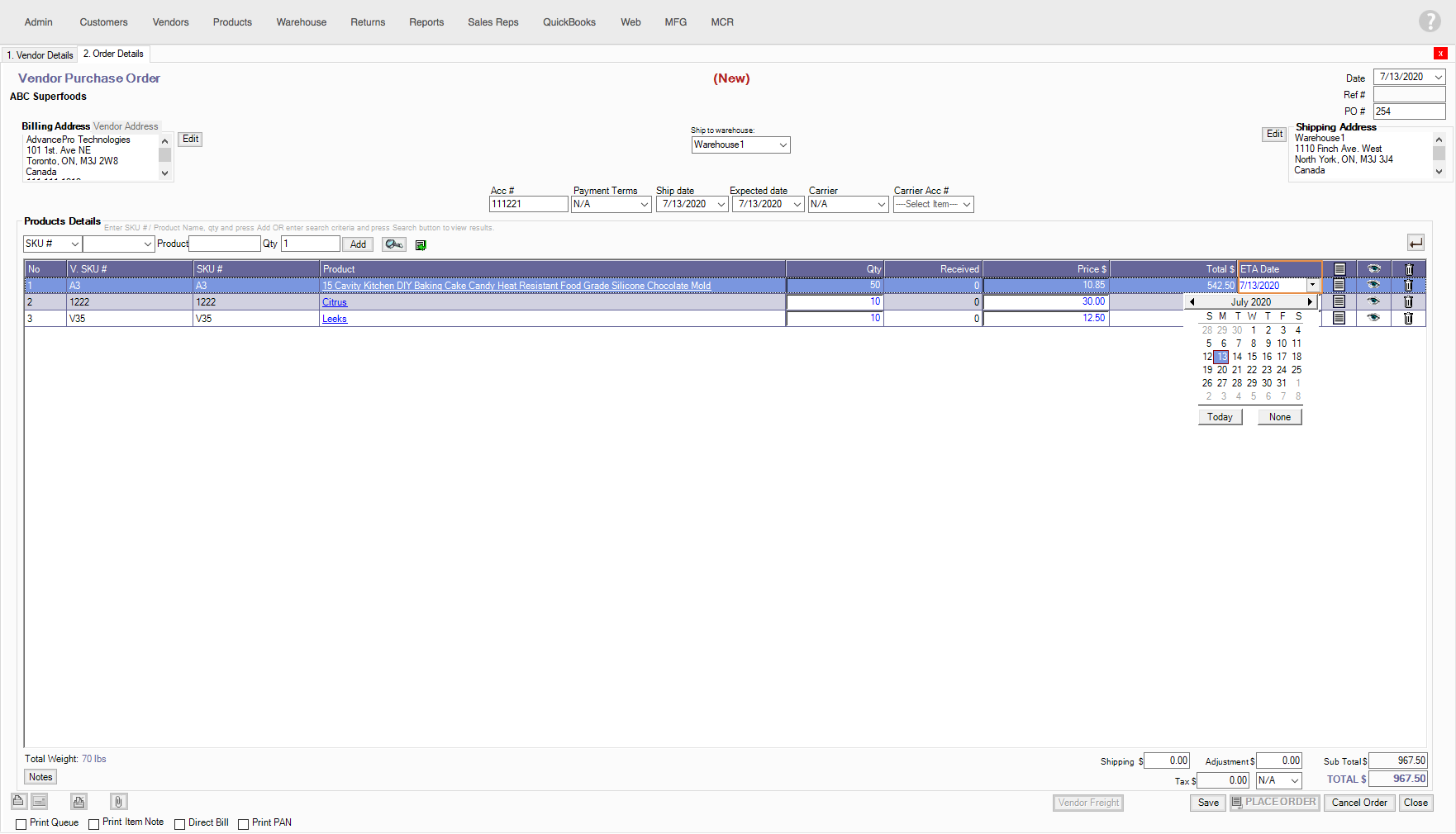 ETA Date column will then be shown in the VPO. Click on the Date, click the drop-down and choose a date.