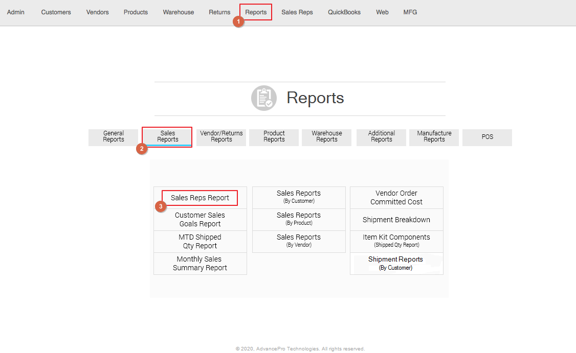• To generate a Report, go to Reports > Sales Reports > Sales Reps Report