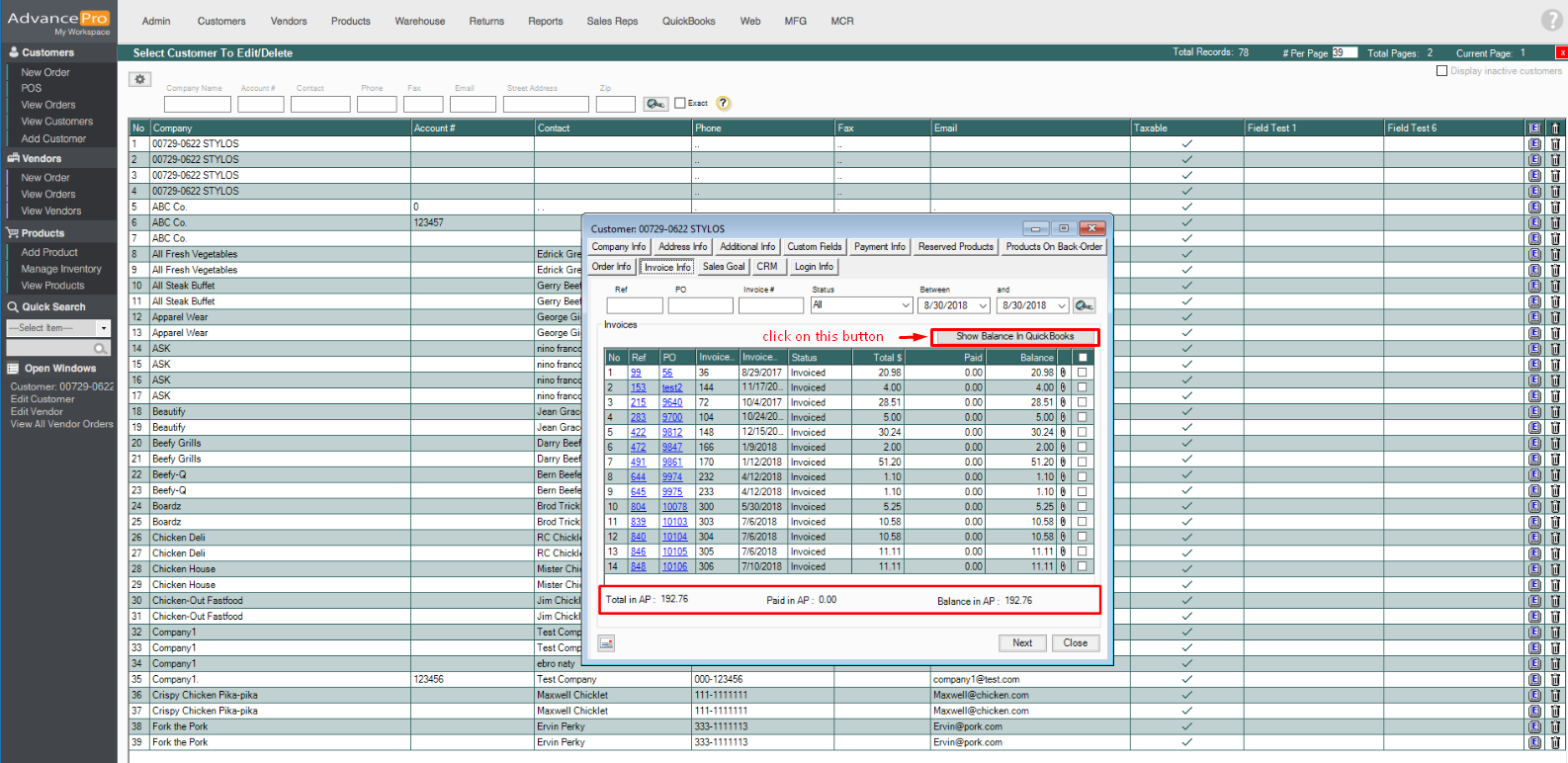 Sales reps can now quickly view outstanding balances when placing new orders for customers. Payments made in QuickBooks are reflected in AdvancePro.