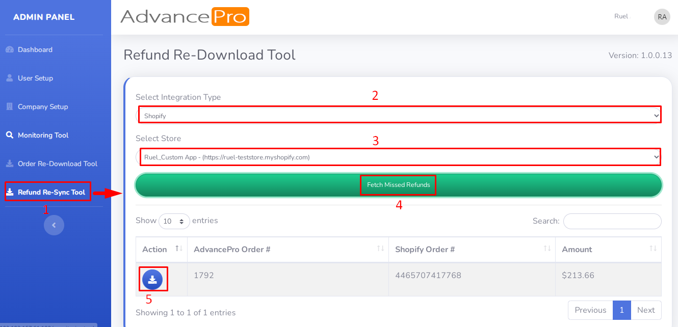 2. Click on Refund Re-Sync Tool > Select Integration Type > Select store > Click on fetch missed refunds > select the missed refund and download by clicking on the icon.