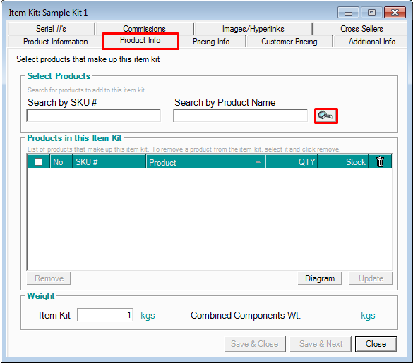 4. The selected items will appear in the Item Kit > Product Info tab. Enter the quantity of the added products