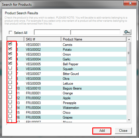 2. Your search results will appear in a separate window. Click the Checkmark to add the product(s) and click