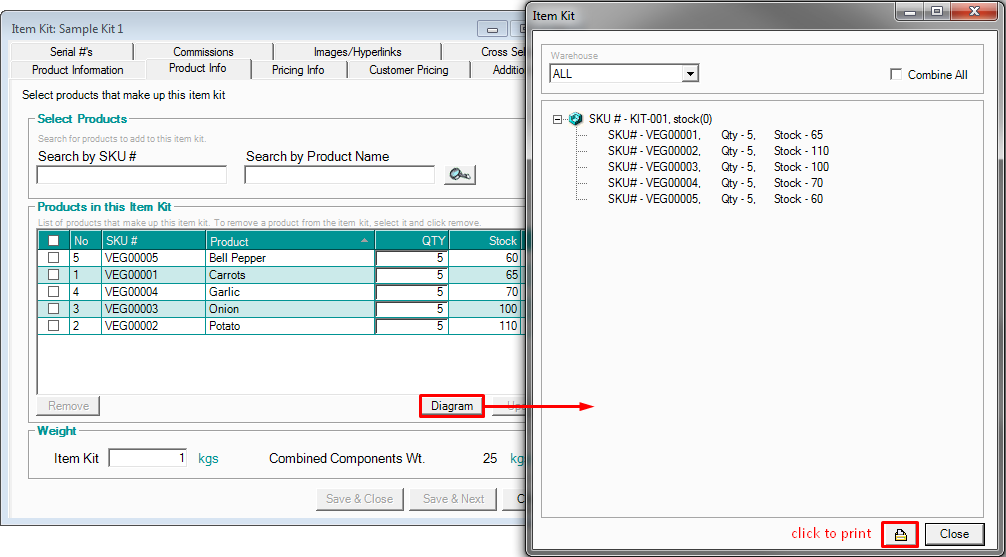 7. To view a diagram showing all the products that make up the kit, and their current inventory levels, click