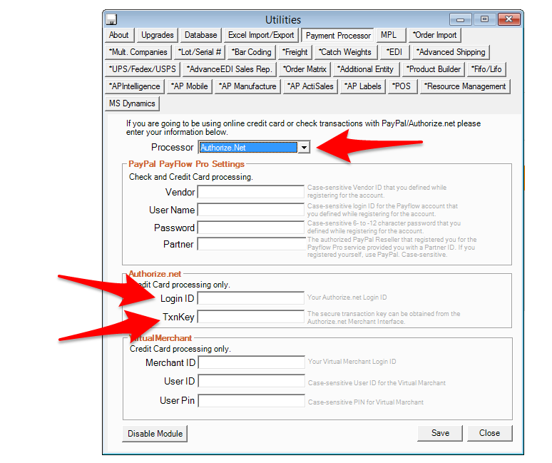 Once you have recorded your Authorize.net API Login ID and Transaction Key, simply perform the steps below to configure AdvancePro to accept credit card payments through your Authorize.net account: