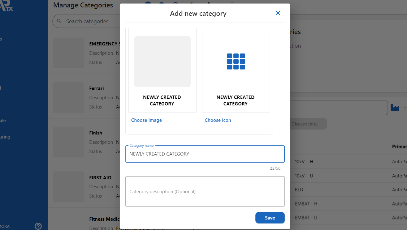 3. Enter the name of the category and hit Save. Optional: You may add a description, select an icon on the free icon library, or upload an image for the category. Click Save when ready