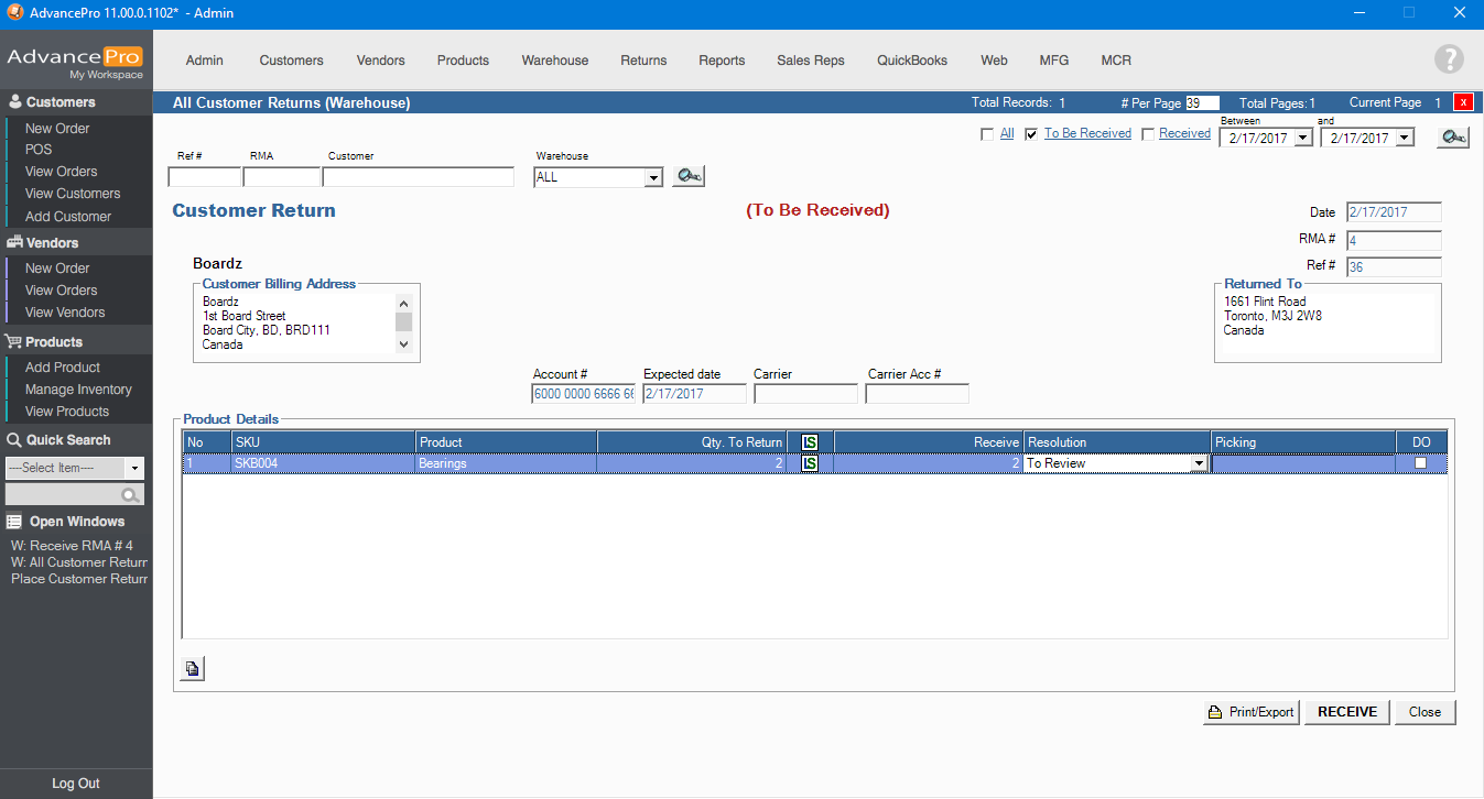 - TO REVIEW - This will allow the user to either SEND TO INVENTORY or DISCARD FROM INVENTORY the returned products