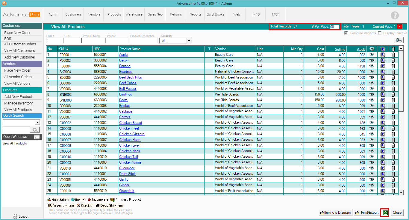 2. Make sure that you include all your products by adjusting the "# per Page" or the number of records to show per page. On the lower right corner, click the Microsoft Excel icon.