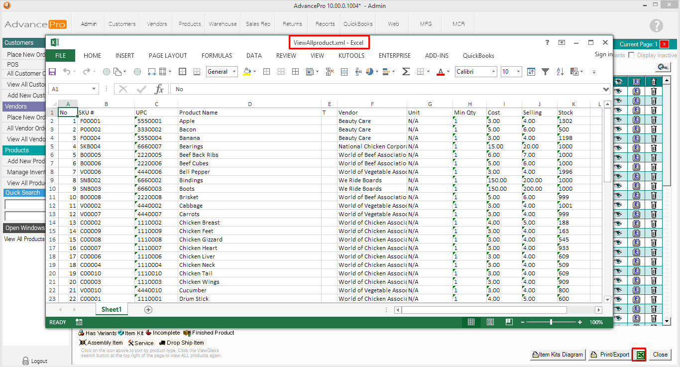 3. A spreadsheet will appear. It will follow the order of the columns as displayed on the View All Products Screen. Note that a space " " is inserted before each UPC and SKU number to "preserve" the zeroes at the beginning of the number.