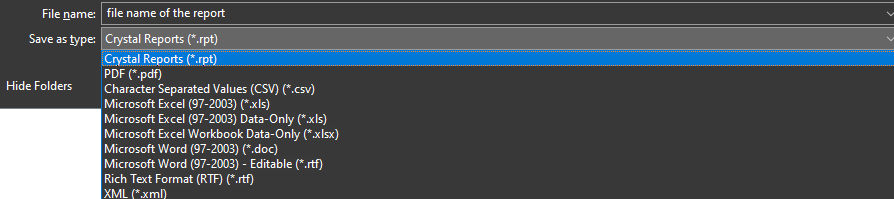 2. Select the format you would like to export . Available formats: RPT, PDF, CSV, XLS, XLSX, RTF, XML