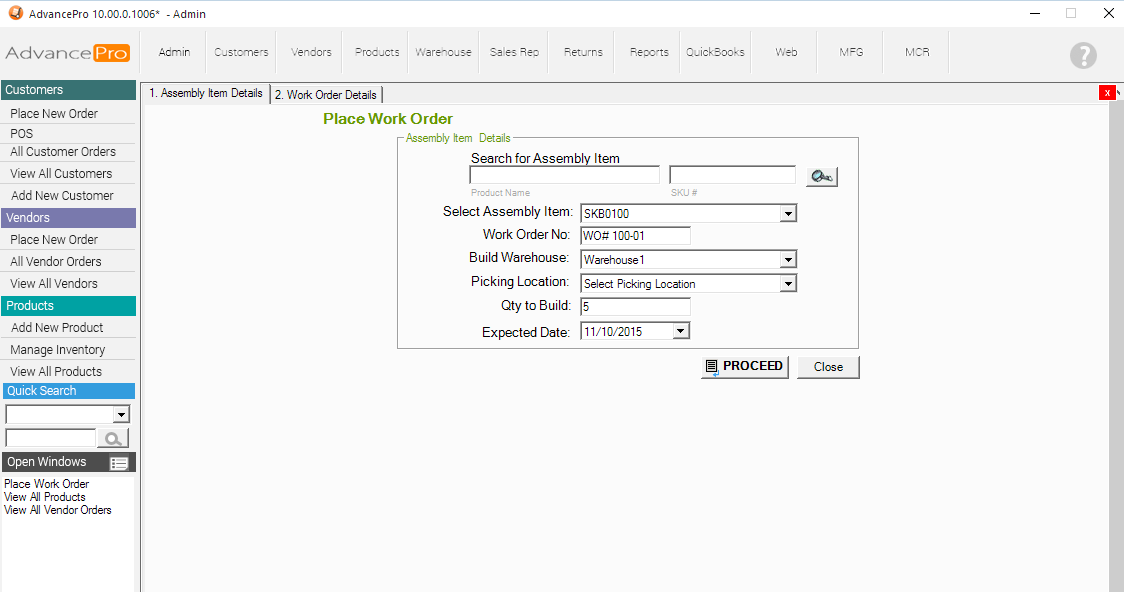 2. Select the Assembly Item for this Work Order and Fill out the other required information