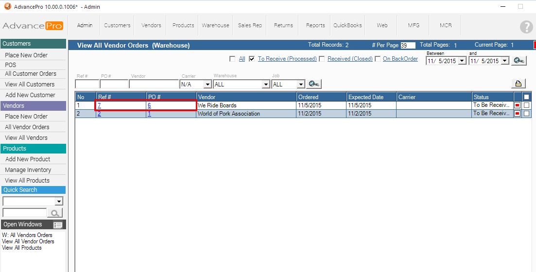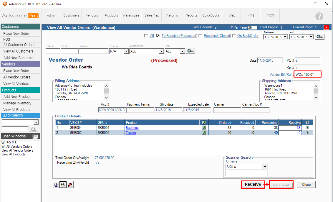 5. Save and Process the Vendor Order to the Warehouse (or you can create a Direct Bill for the order)