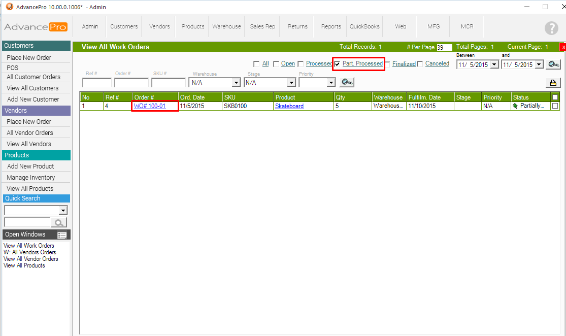 9. Locate the previous work order under Partially Processed Status