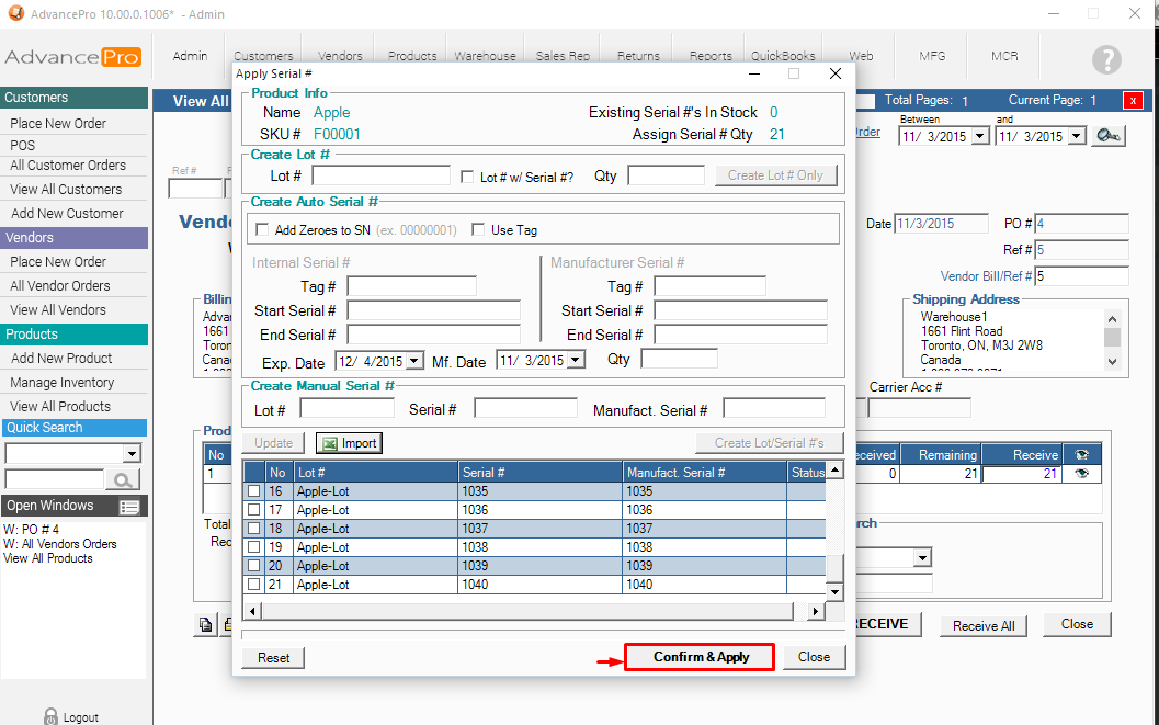 10. You can also go to View/Edit All Products and locate your product >> Hit the [E] Edit Icon >> Serial #'s Tab and you will be able to view the details of the lot and serial numbers, with their VPO Ref #