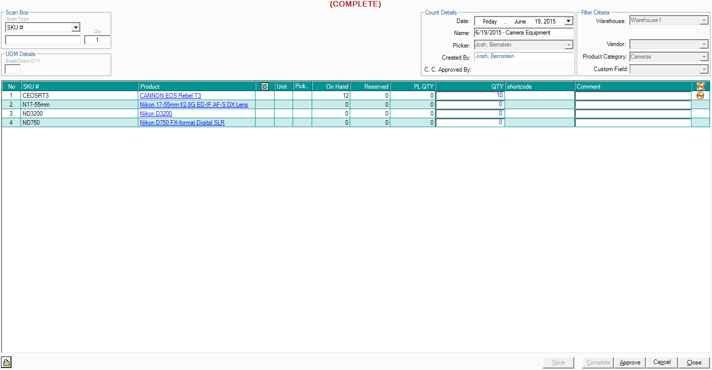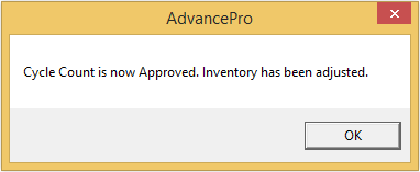 - Review the cycle count, comparing "On Hand" quantities with "QTY" entered during the cycle count, then click "Approve" to update the quantity in AdvancePro